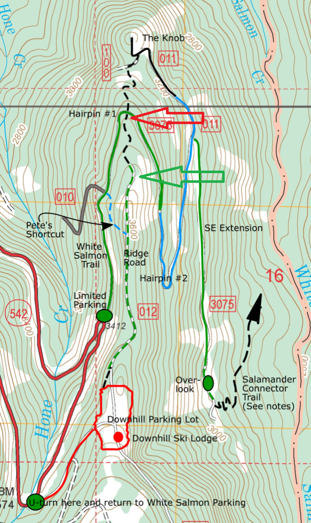 - Sunday, August 24 -10:00 – 1:30 – .Meet at 10:00 a.m. at the first hairpin of the White Salmon Road (red arrow – plenty of space to park). We will work on the Ridge Road Trail (green arrow) and Pete’s Shortcut clearing back brush to connect the White Salmon Trail with the Mt. Baker Ski Area.
