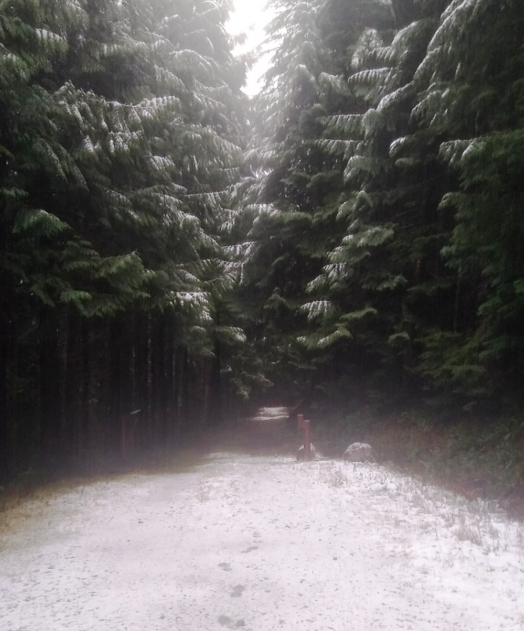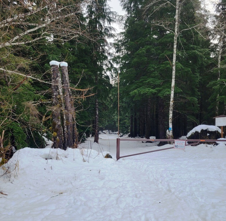 2025-12-18: Everything here is now obsolete. The road is open (sort of) and it has snowed (somewhere…). The two official places to look for information are on the WSDOT site: the Pass Report – https://wsdot.com/travel/real-time/mountainpasses/mt.-baker and the Alerts Page – https://wsdot.com/travel/real-time/alerts/road/542 . We asked WSDOT for permission to go up and lock the gate at Salmon Ridge and were allowed through. We cleared a number of small trees that blew down over the last few days, but Razor Hone, Cougar Loop and Anderson are looking good! There was a little snow at the top of Cougar Loop (see picture – if you can’t see, that’s about 1/2 inch out in the open, nothing near the trees) but bare gravel everywhere else.