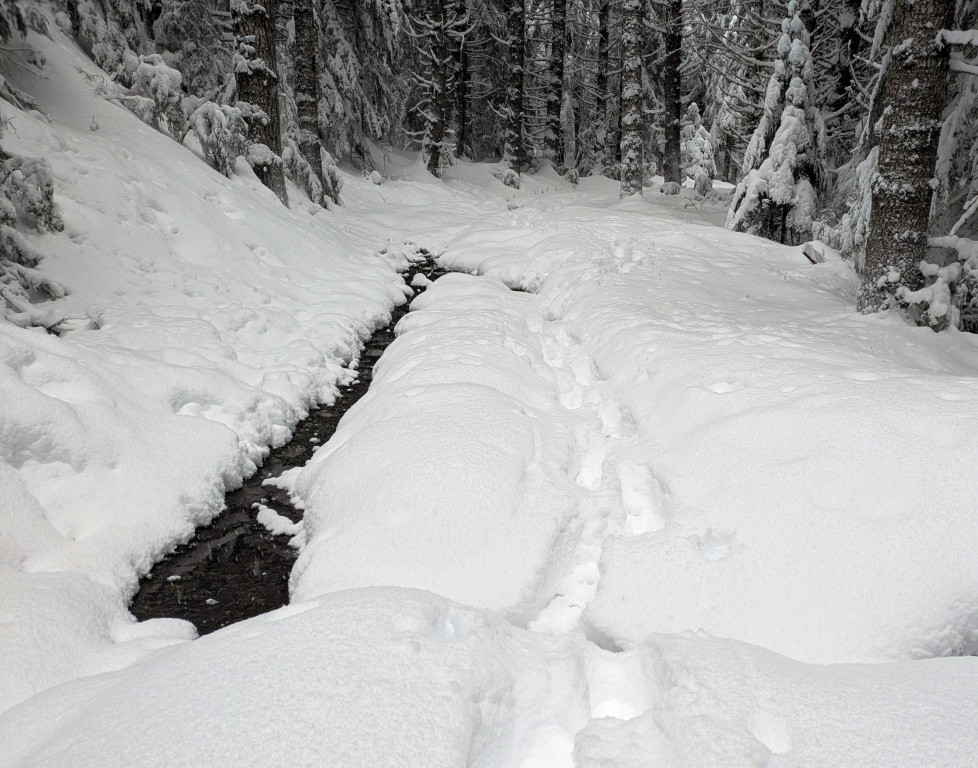 2025-12-23: A report about snow! thanks, Mark, for sending this in! White Salmon: The little parking area isn’t plowed, so currently there is space for only 2-3 cars. Conditions are….interesting: ~36″ snow out in the open, the top foot or two of which is nice, dry, unsupportive powder, so deep ski and pole penetration. A trench runs up the middle, set mostly by a few skiers and snowshoers before I got there. I believe all that fresh snow is supposed to get rained on tomorrow afternoon, then re-freeze shortly thereafter. Salmon Ridge has about 6 or 8 inches of damp fresh snow on anyplace exposed to the open sky. Its parking lot is also unplowed, and it is therefore on the verge of turning into a giant, beat-up lake of half-frozen slush.