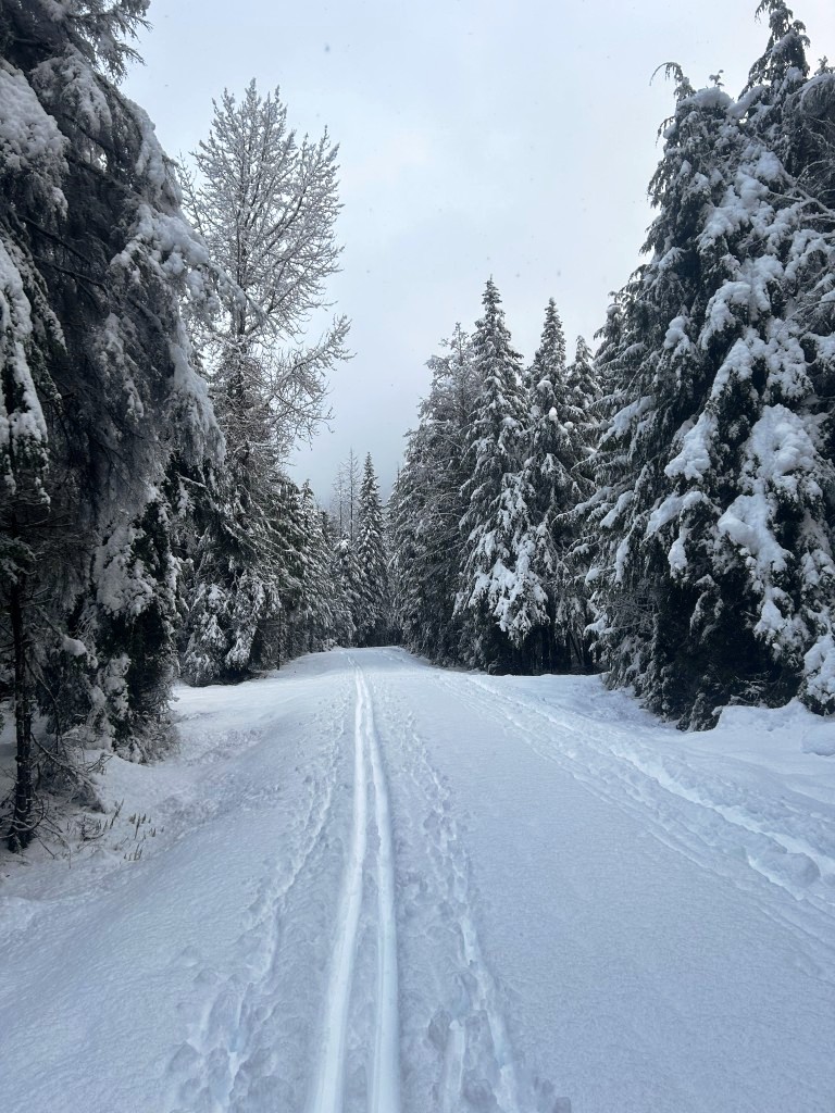 Significant amounts of snow are predicted for the rest of the week. Hopefully we’ll see tracks soon. The snow wasn’t wet – extra blue on classical skis would have been perfect.