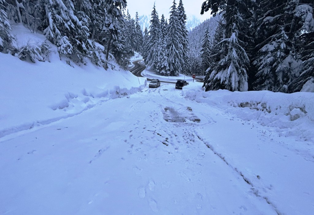 2024-12-26: “Some new snow and new monster truck ruts. We were able to ski from the lot to halfway down the hill after the 2nd switchback at White Salmon. We had from 12″-3″ before we turned around. It was snowing and sticking. While we were out ~1″ of snow built up on our car.” – Carl