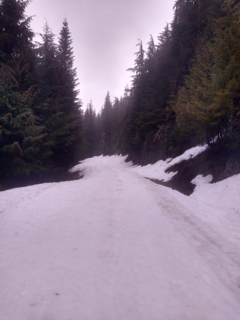 First stop: Heather Meadows. It was snowing, with lots of snow on the ground. It was ‘consolidated’ and ‘solid’, but not icy, with 2 inches of fresh snow on top. It was wonderful! You could go anywhere! Which meant that I was able to ski on long traverses, both up and down hill, so that it was easy to ski at reasonable speeds and under control. I went up a little past the FS visitors center. (the black dot below ‘3090’ in the blue area: https://www.nooksacknordicskiclub.org/trails/descriptions/10-heather-meadows/ ) I don’t want to send people off beyond their abilities, but you could have a good time on these long traverses with light-touring skis. Don’t plan on going to Artists Point, but an hour out on skis should be delightful. (And racers, it looks like there should still be enough snow for the Ski to Sea…)
